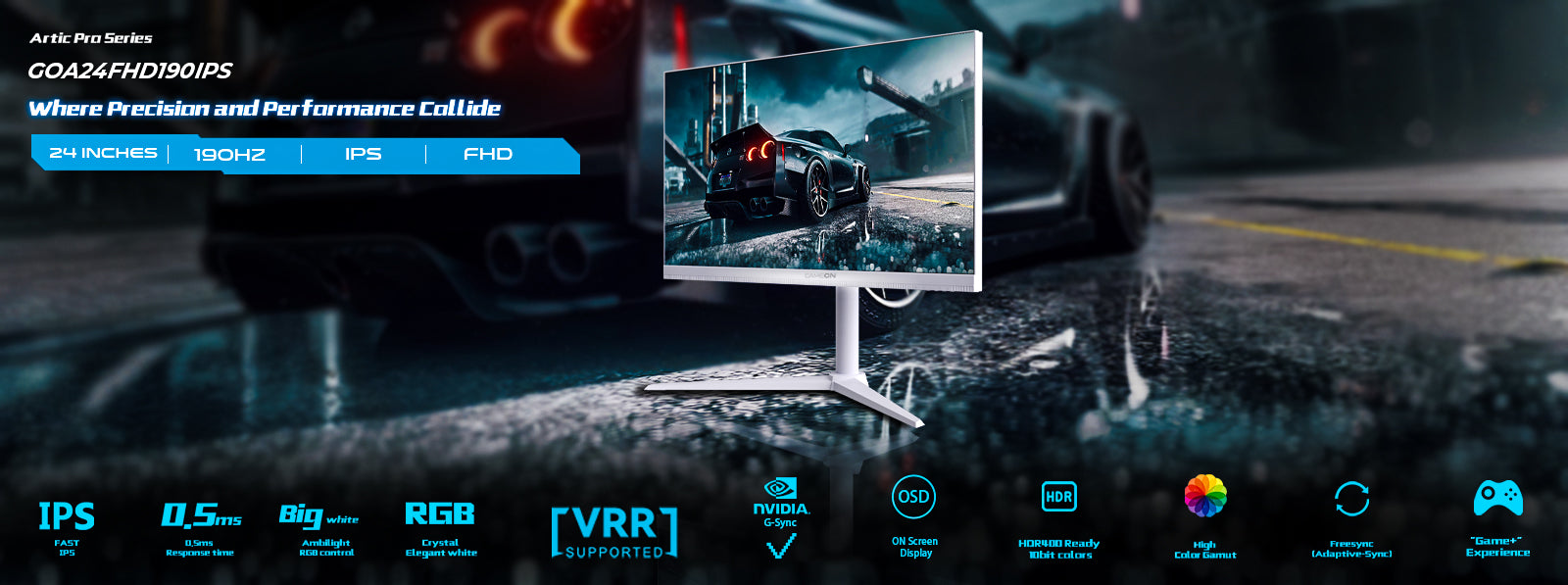 The GAMEON GOA24FHD190IPS Arctic Pro Series monitor is a powerhouse for gaming enthusiasts, offering top-tier performance and cutting-edge features tailored for a seamless gaming experience. With a sleek white design, this 24-inch Full HD (1920 x 1080) display is perfect for gamers who demand both aesthetics and functionality.