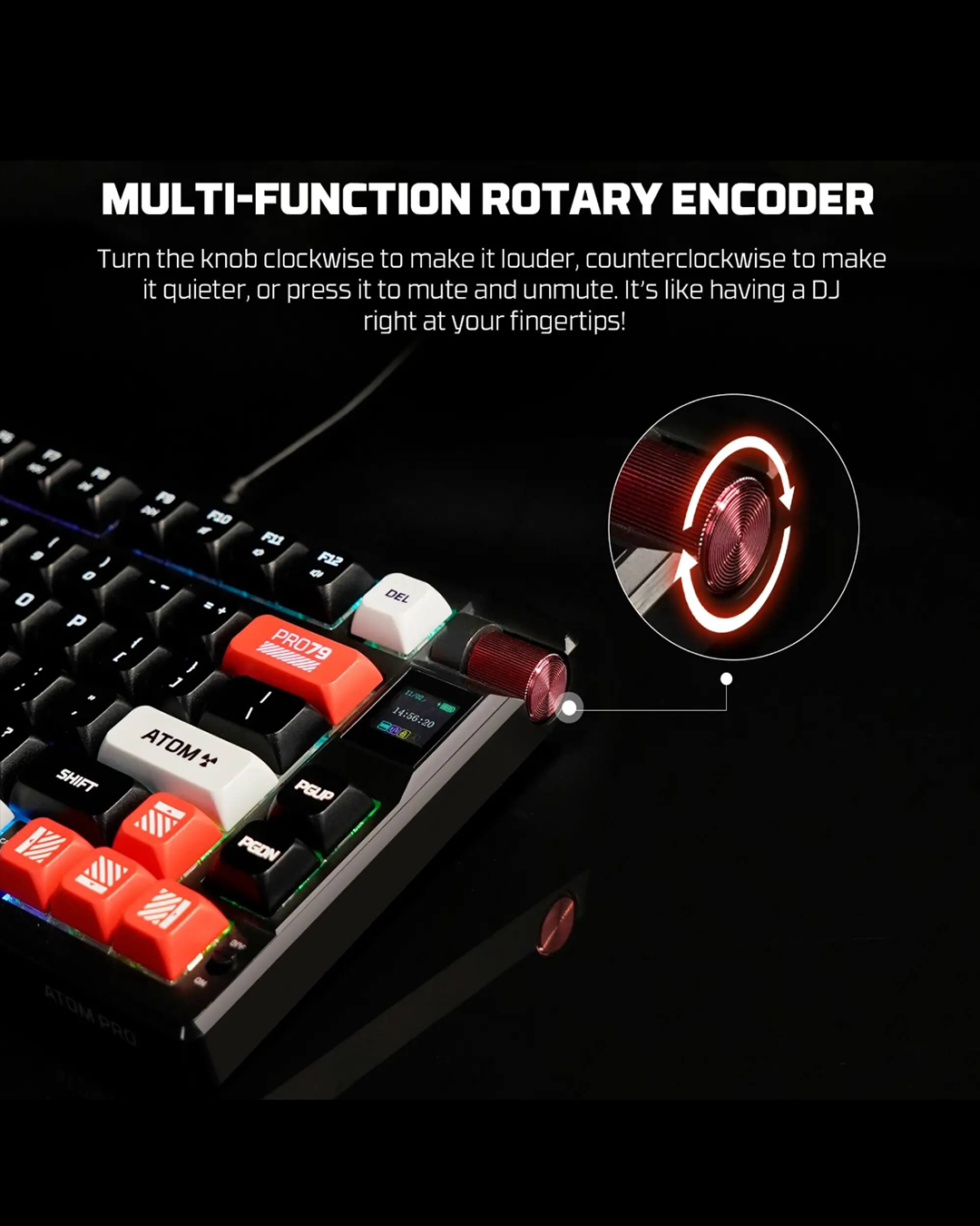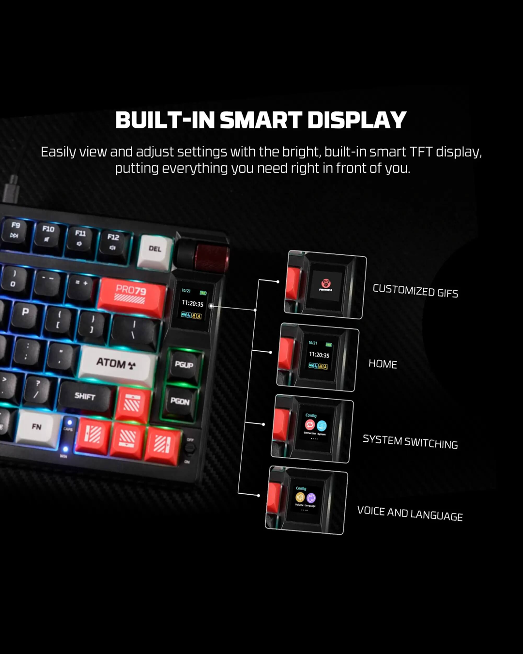 A premium feature of the MK917 ATOM PRO79 is the Smart Display Screen, which adds both functionality and style. This screen shows useful real-time information such as battery level, connection mode, time, and system status, helping you stay informed at a glance while enhancing the keyboard’s overall premium feel.