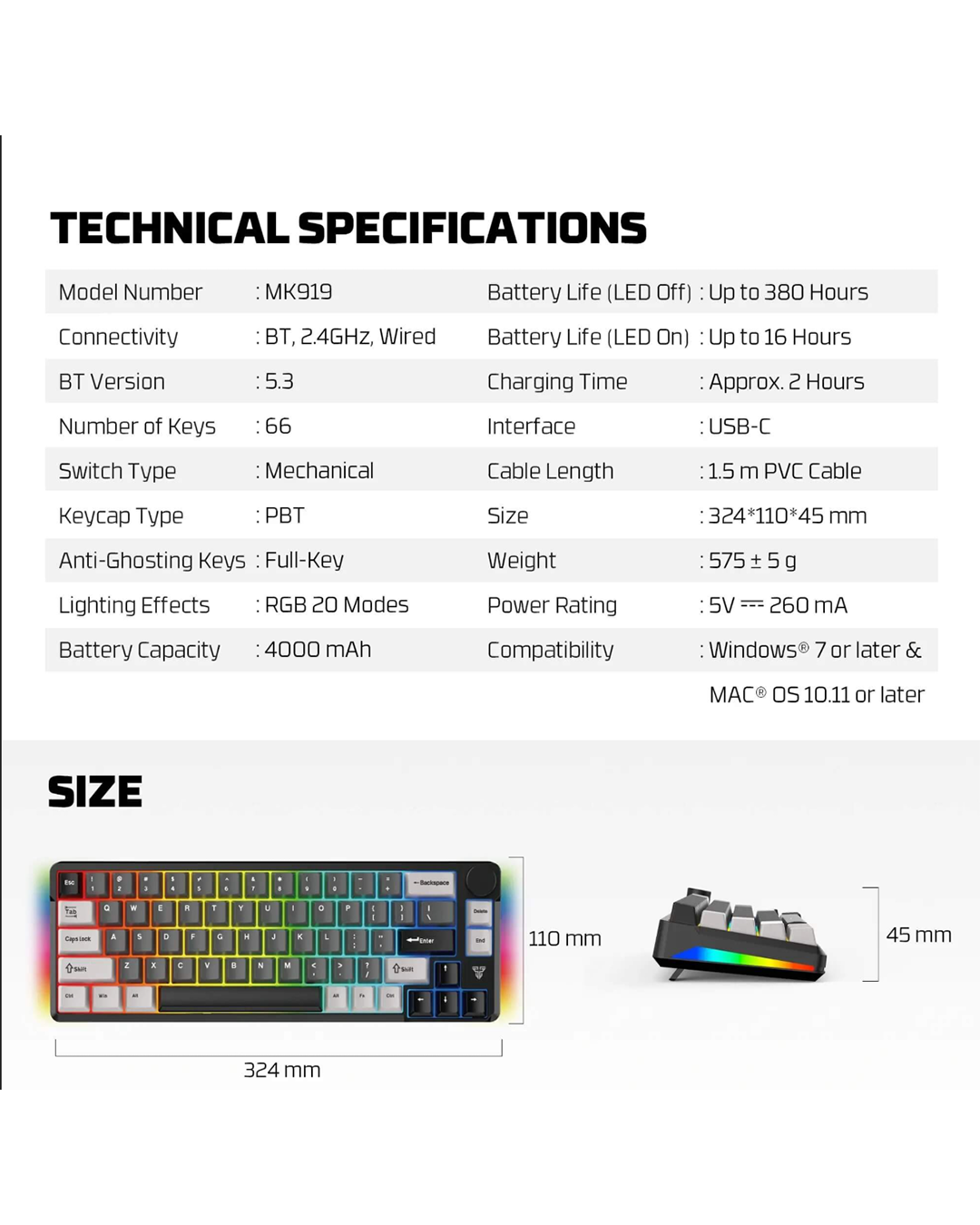 Thanks to its 66-key compact layout, the MK919 Atom Pro removes unnecessary keys while keeping all essential controls accessible through smart key combinations. This layout gives you more mouse space, improving comfort and control—especially important for FPS and competitive gamers. Despite its compact size, the keyboard maintains excellent build quality and durability for long-term use.